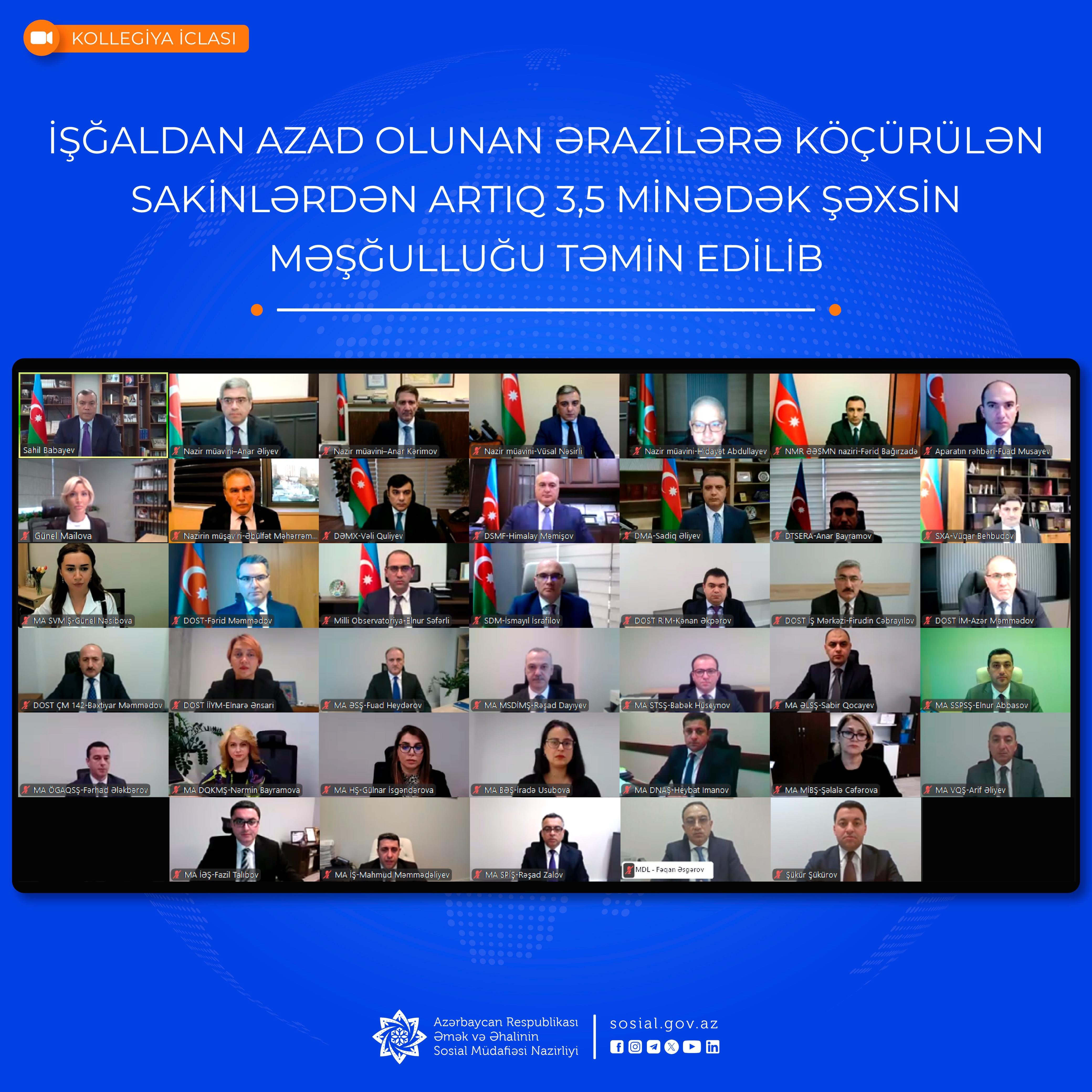 Əmək və Əhalinin Sosial Müdafiəsi Nazirliyinin fəaliyyətində başlıca istiqamətlərdən biri də işğaldan azad edilmiş ərazilərimizə köçürülən sakinlərin aktiv məşğulluq proqramları ilə əhatə olunmasıdır. Bu barədə Nazirlikdə keçirilən növbəti kollegiya iclasında bildirilib.
