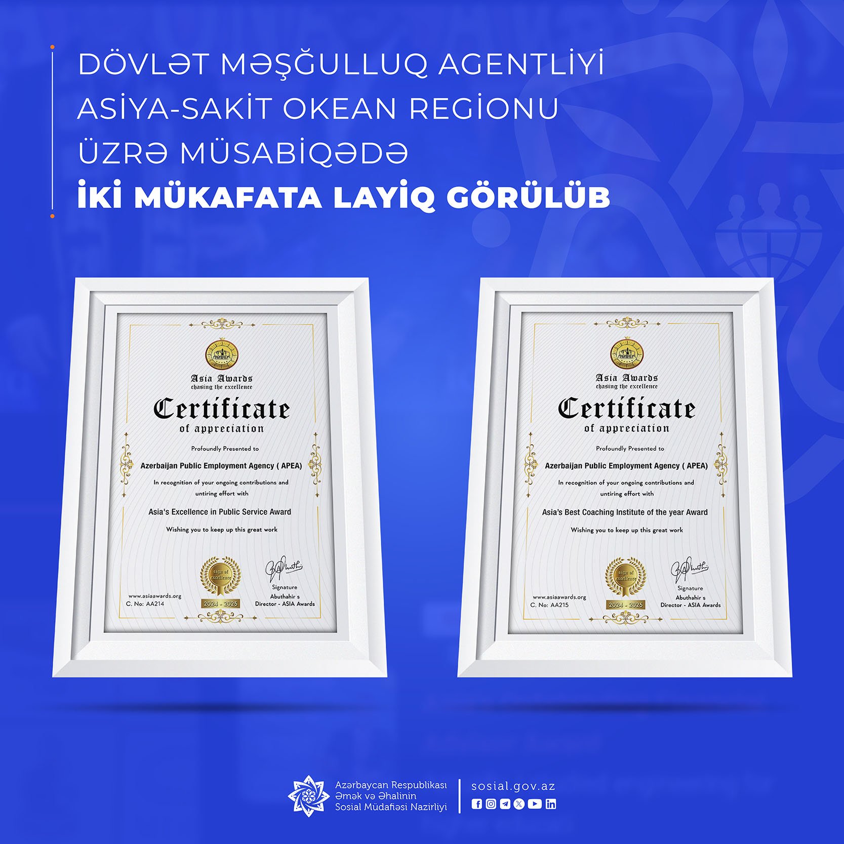 Dövlət Məşğulluq Agentliyinin adı qalib olaraq “Asia Awards” mükafatının rəsmi səhifəsində də yer alıb. (https://www.asiaawards.org/news/azerbaijan-public-employment-agency-has-bagged-asia's-excellence-in-public-service-award)