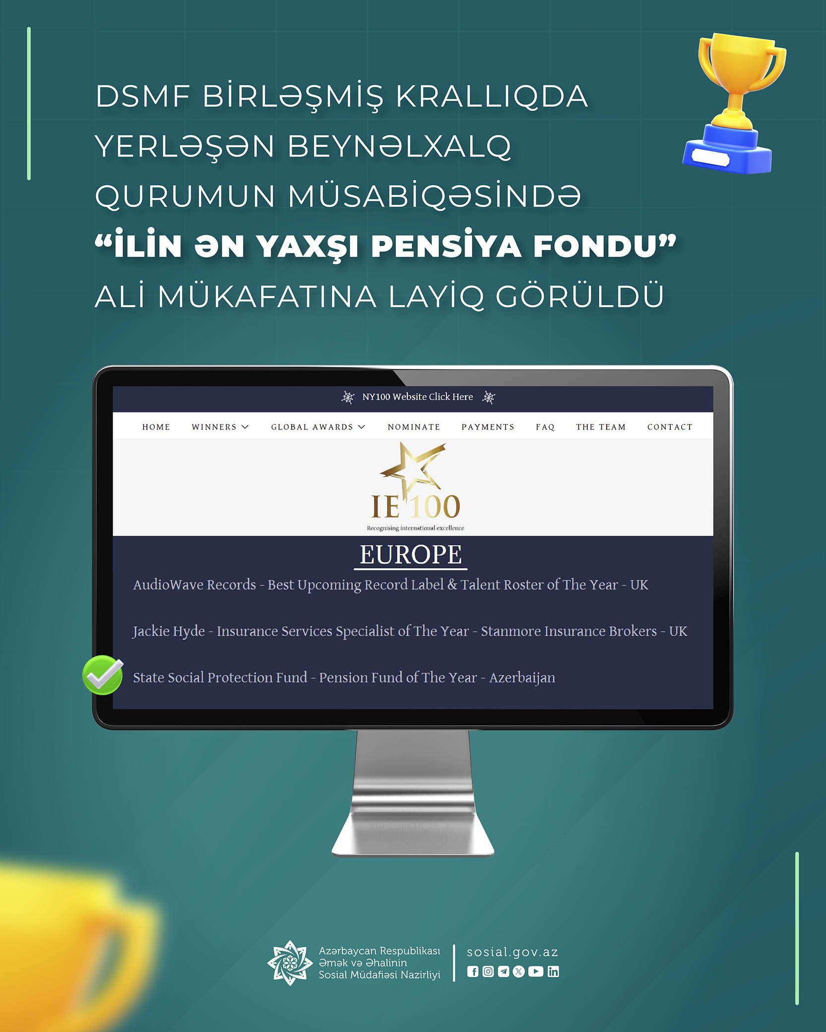 Əmək və Əhalinin Sosial Müdafiəsi Nazirliyinin tabeliyində Dövlət Sosial Müdafiə Fondu (DSMF) “The International 100 Awards 2025” beynəlxalq müsabiqəsində də uğur qazanıb.
