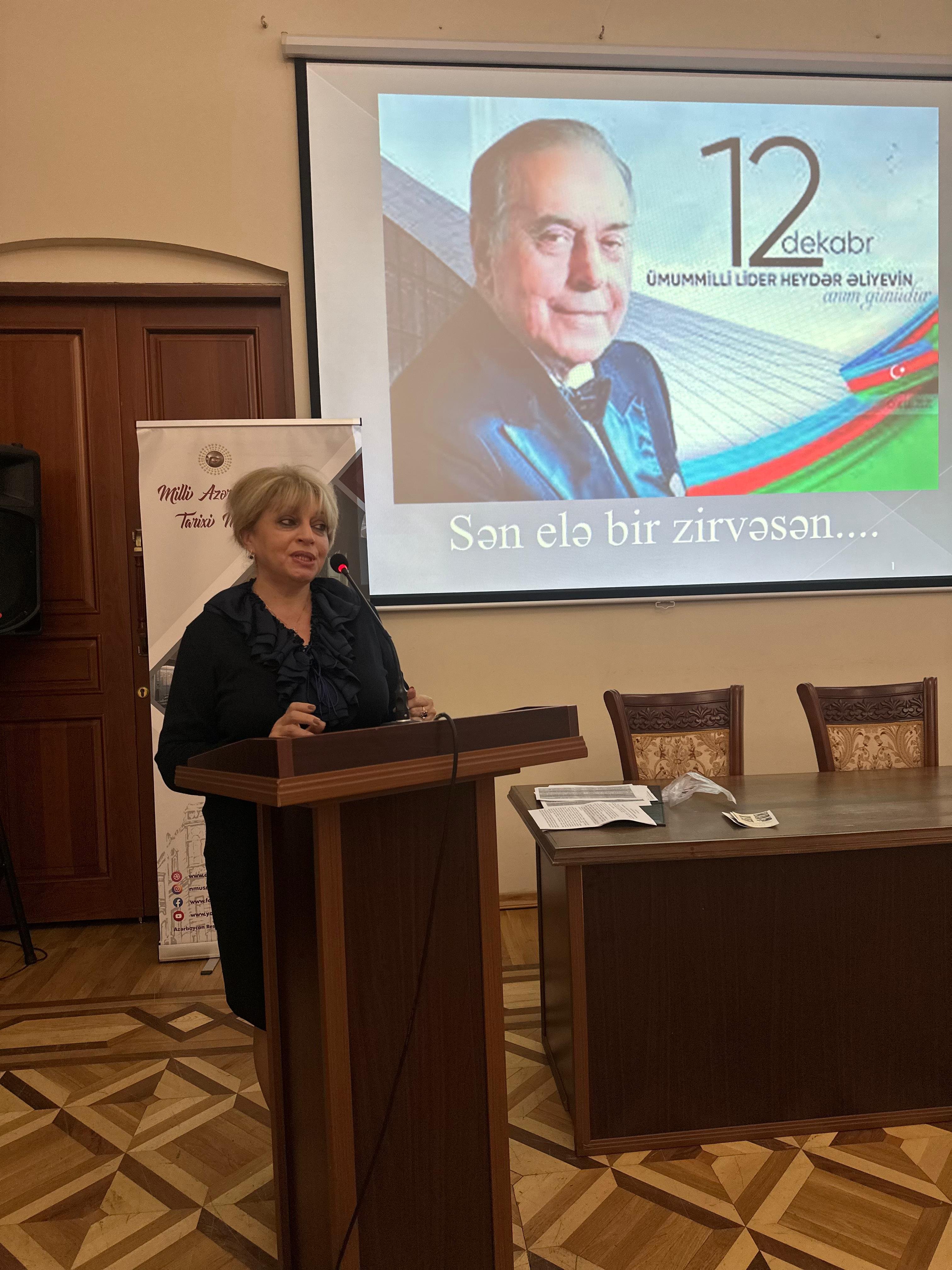 Tədbirin davamında Muzeyin əməkdaşı Aynur Babayeva foto-slayd təqdimatı ilə “Heydər Əliyevin Azərbaycan mədəniyyətinin inkişafındakı rolu” mövzusunda məruzə edib. O, Ulu Öndərin mədəniyyət sahəsinə göstərdiyi böyük diqqət və qayğıdan danışaraq qeyd edib ki, Heydər Əliyevin hakimiyyəti illərində Azərbaycanda muzey işi sürətlə inkişaf edib və yeni mərhələyə qədəm qoyub. Bu inkişafın bariz nümunəsi olaraq ölkədə yüzə yaxın tarix-diyarşünaslıq və xatirə muzeylərinin yaradılması xüsusi vurğulanıb.