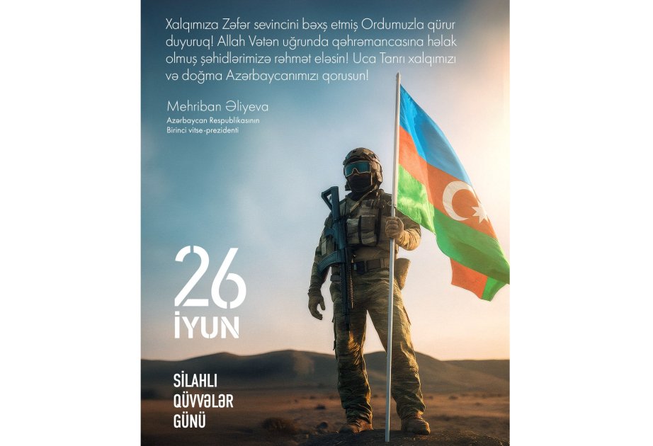 Azərbaycan Respublikasının Birinci vitse-prezidenti Mehriban Əliyeva rəsmi instaqram səhifəsində 26 İyun - Silahlı Qüvvələr Günü münasibətilə paylaşım edib.